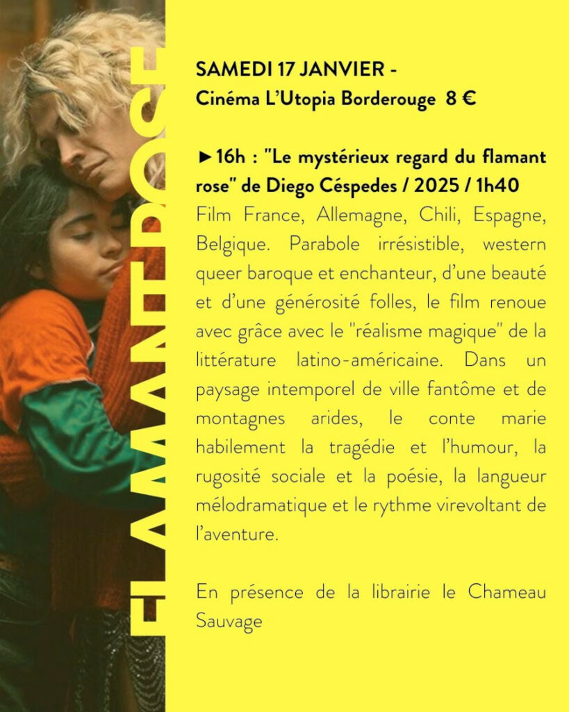 Venez assister à la projection du film Le mystérieux regard du flamant rose, écrit et réalisé par Diego CÉSPEDES (Chili, 2025, 1h40). Parabole irrésistible, western queer baroque et enchanteur, d’une beauté et d’une générosité folles, le film renoue avec grâce avec le « réalisme magique » de la littérature latino-américaine.